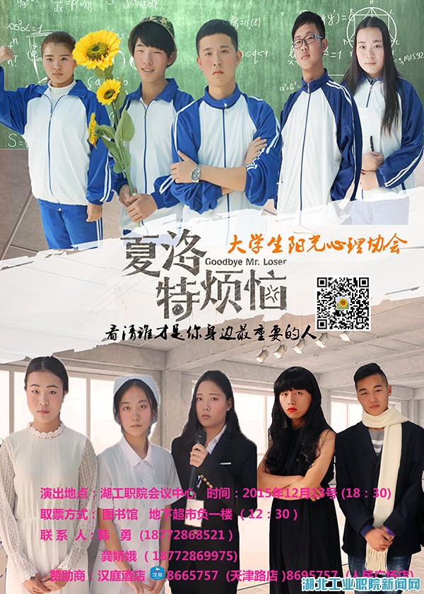 为进一步丰富我院校园文化生活,倡导当代大学生树立正确的人生观、爱情观,大学生阳光心理协会经过前期精心排练、汇演、试演,现将举办本学期第一场大型话剧公演,欢迎广大师生届时前来观看。
