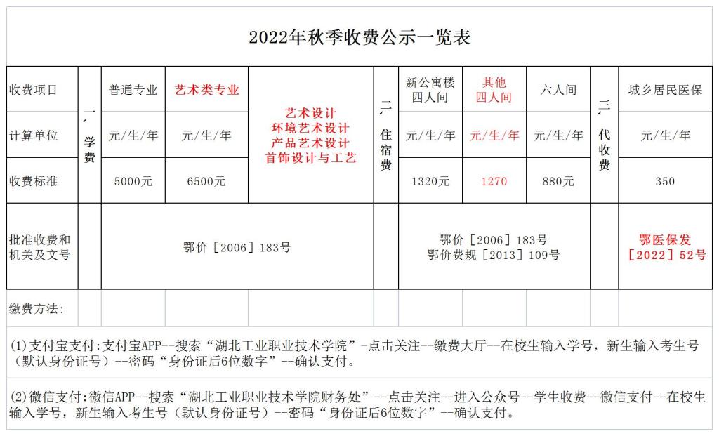 2022年秋季收费公示一览表