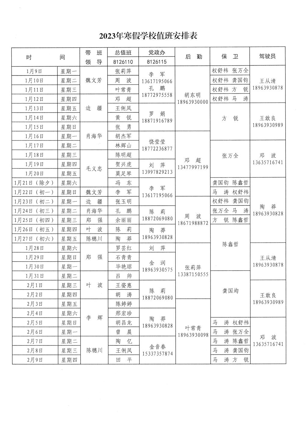 2023年学校寒假值班表