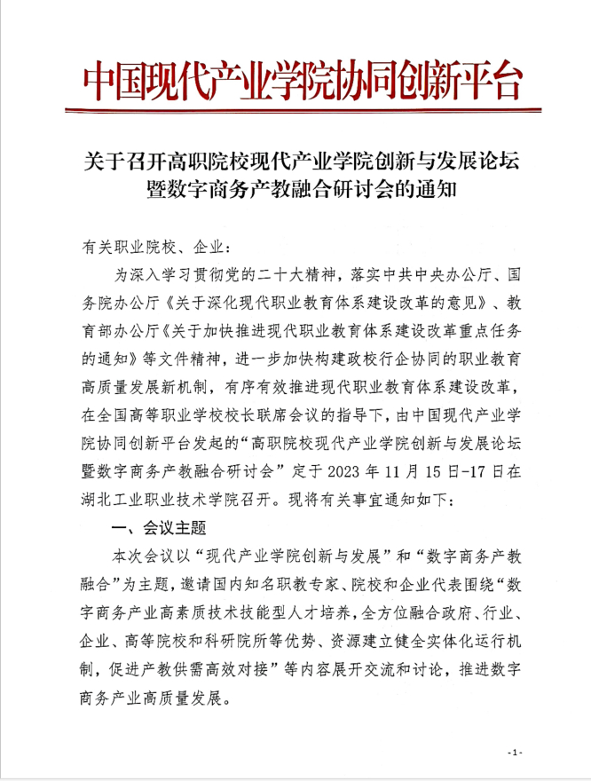 关于召开高职院校现代产业学院创新与发展论坛暨数字商务产教融合研讨会的通知