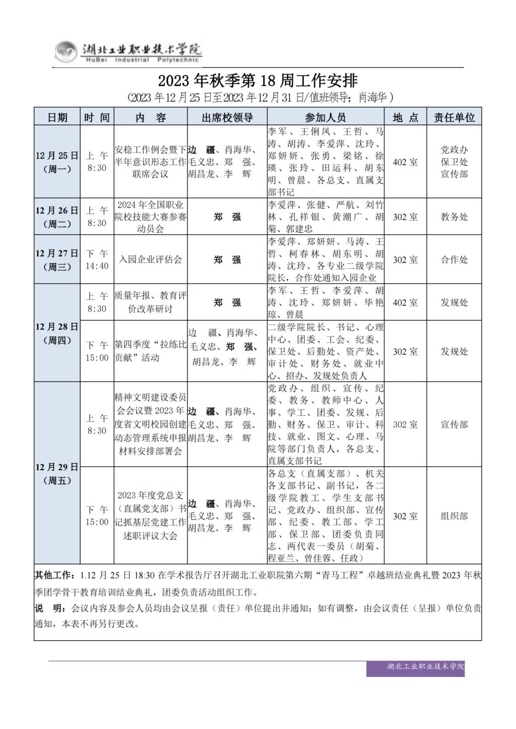 2023年秋季第18周工作安排
