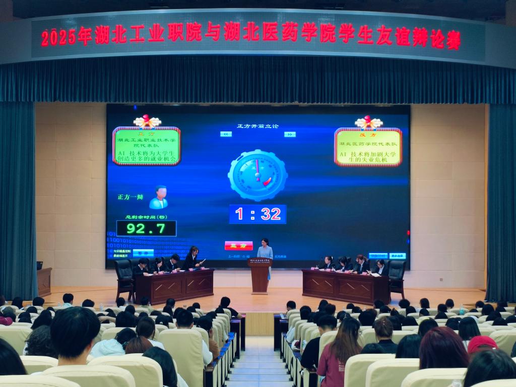 新闻网讯(文/郑丽琼 吴文杰 图/张云)智“辩”启未来,职场创新机。5月12日晚,我校与湖北医药学院学生友谊辩论赛在和山会堂举行,教务处、马克思主义学院、校团委、学工处、公共教育学院等部门负责人、老师出席活动并担任评委,我校与兄弟院校共四百余名学生代表现场观摩学习。